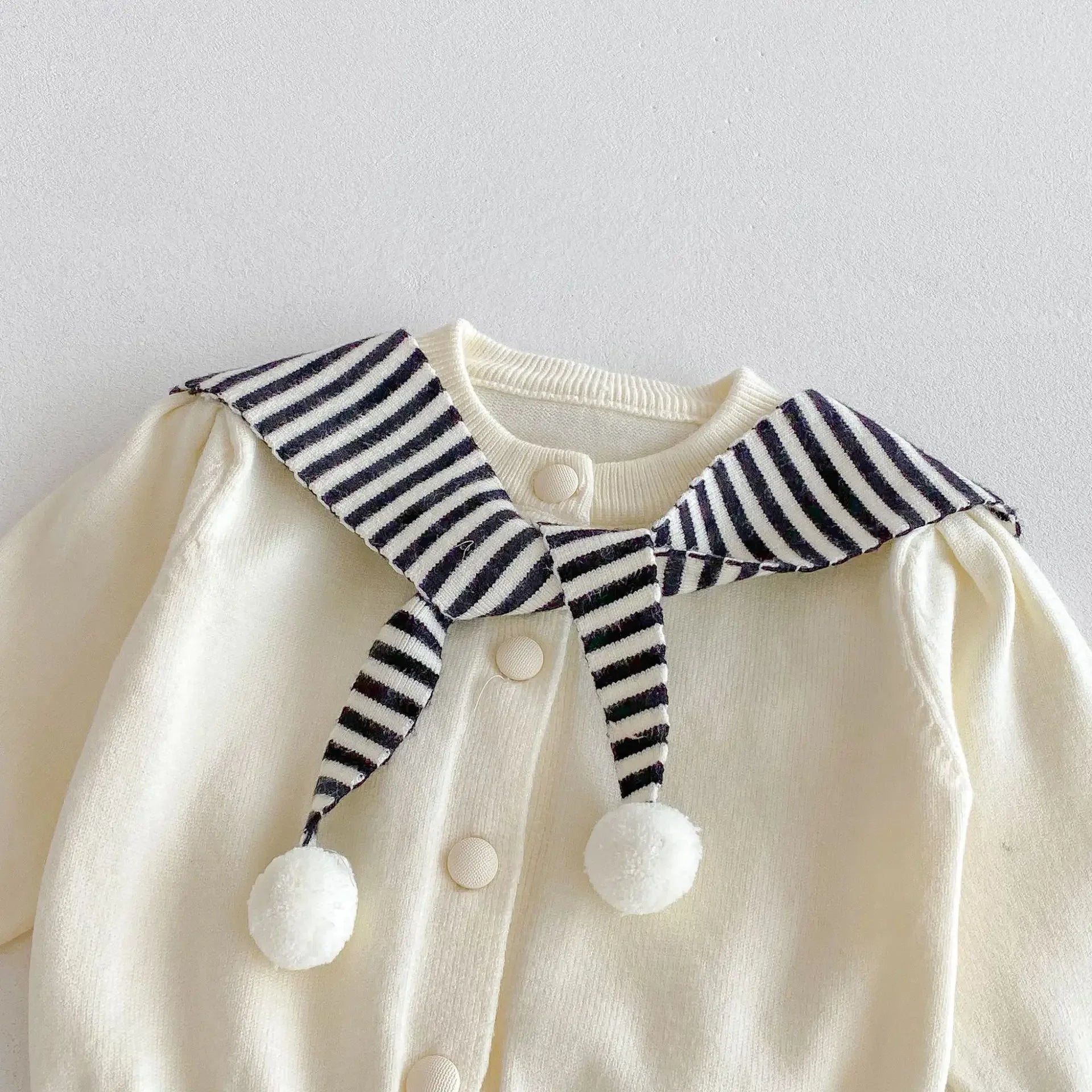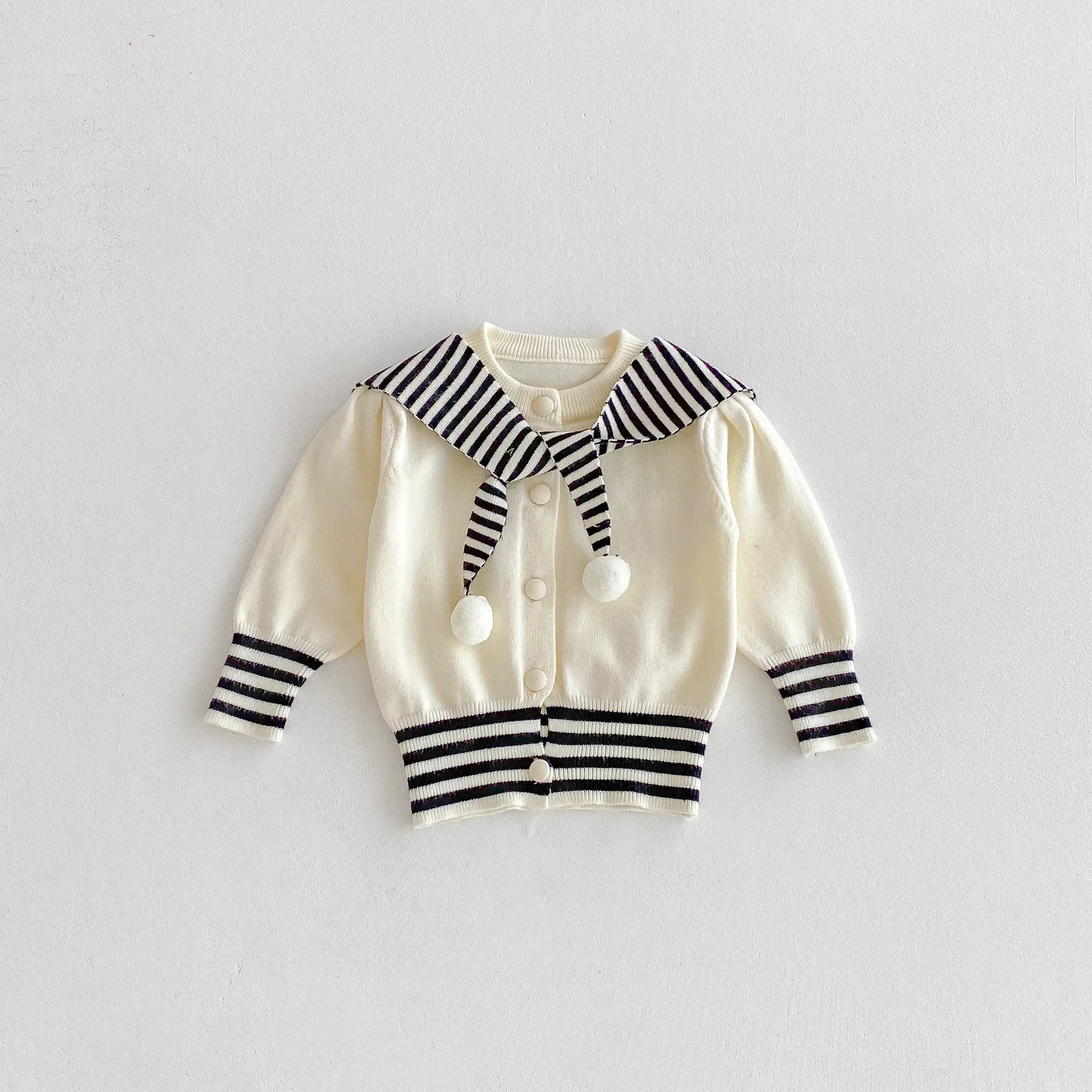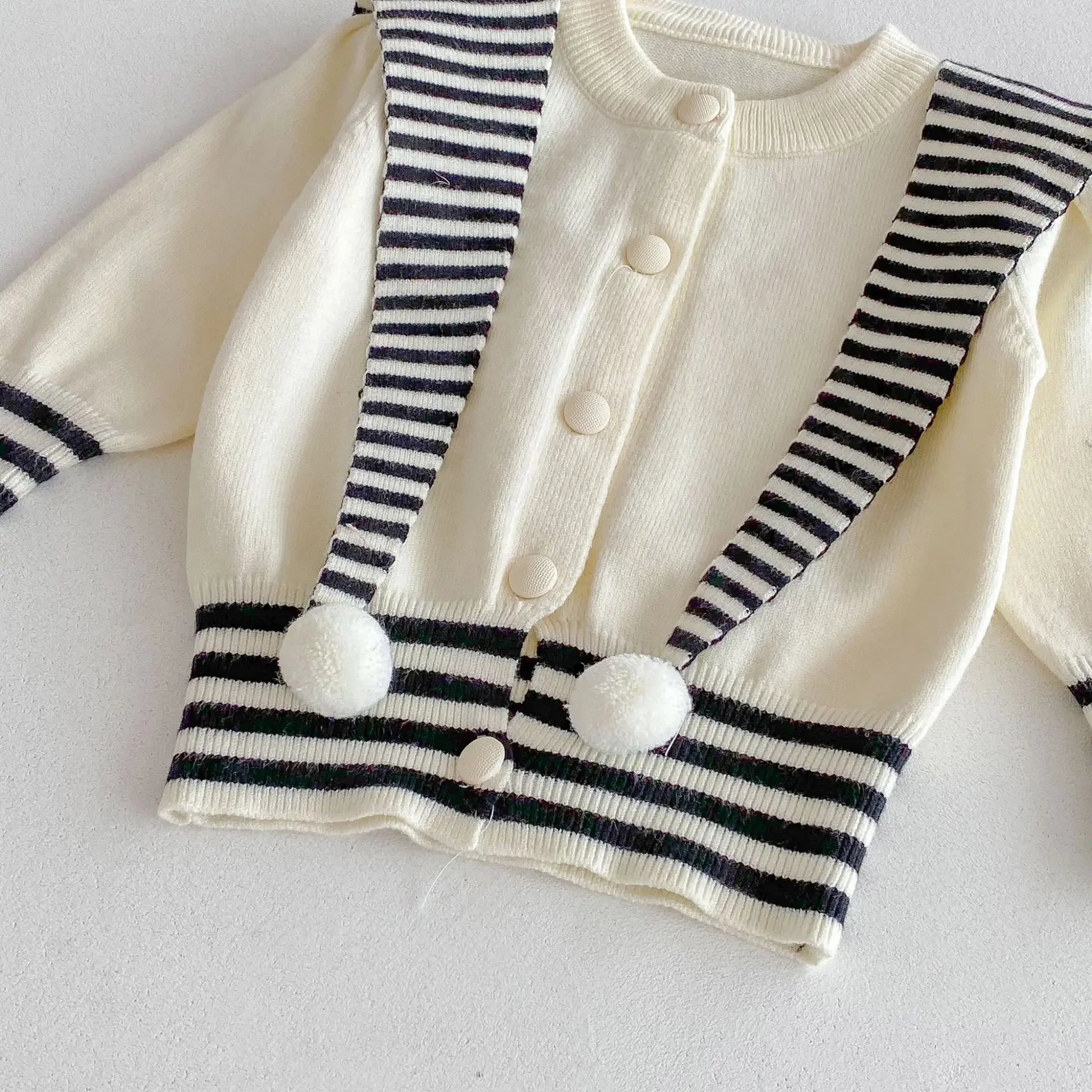 Navy Striped Collar Pom-Pom Knit Cardigan