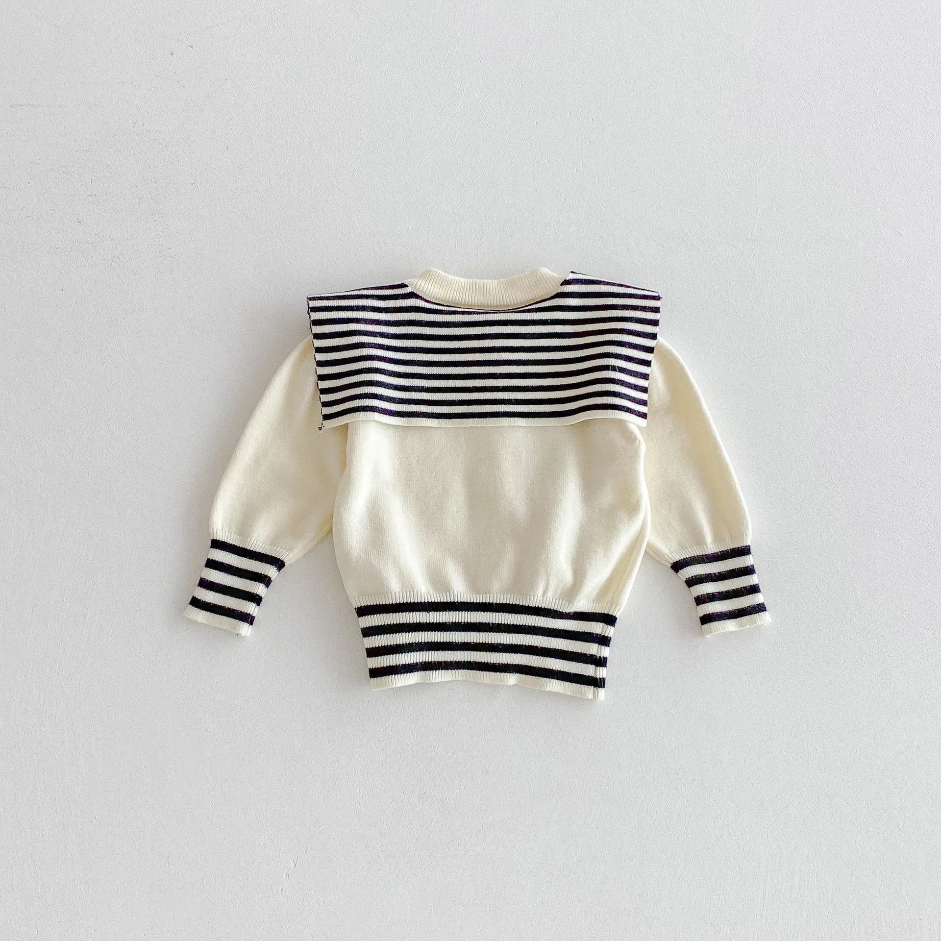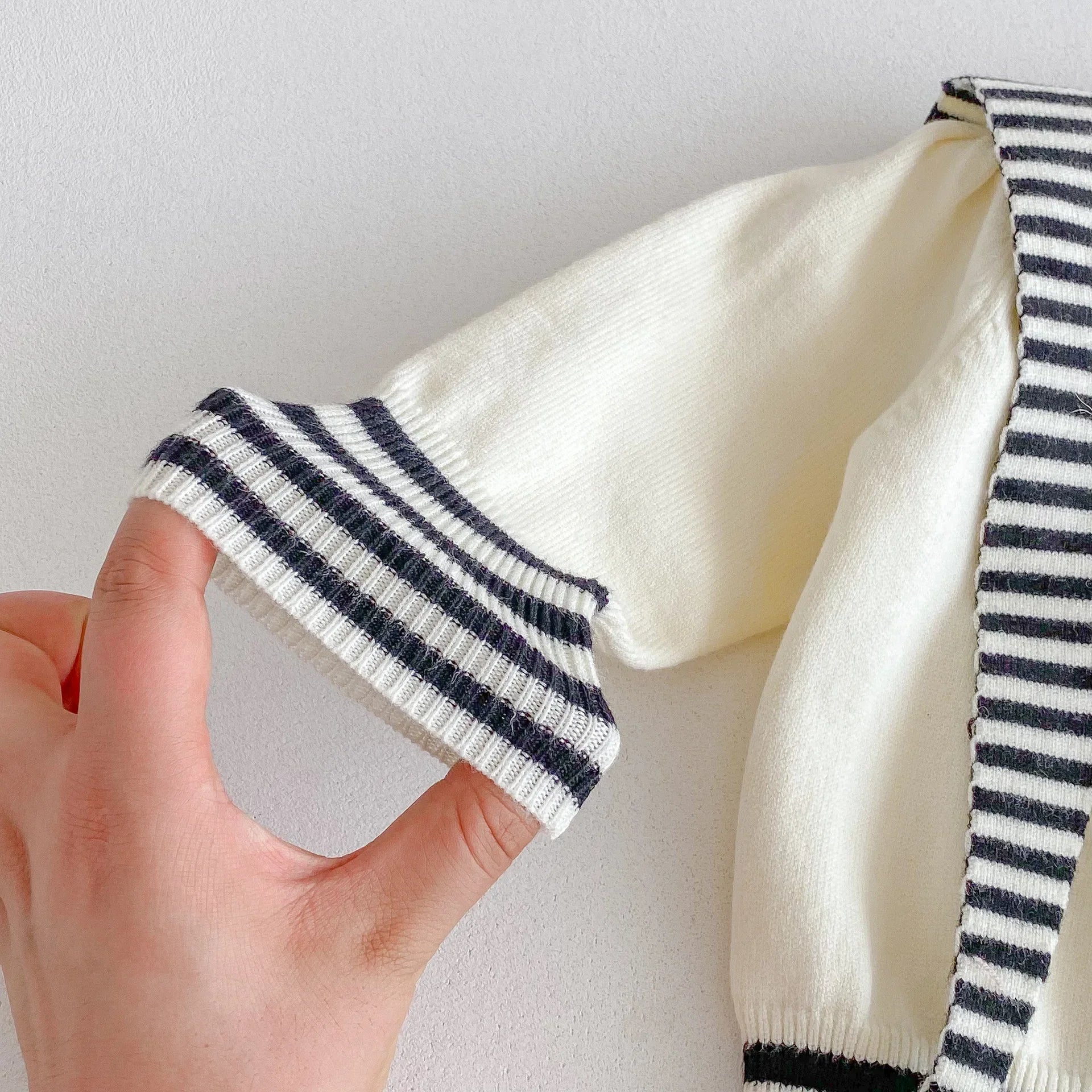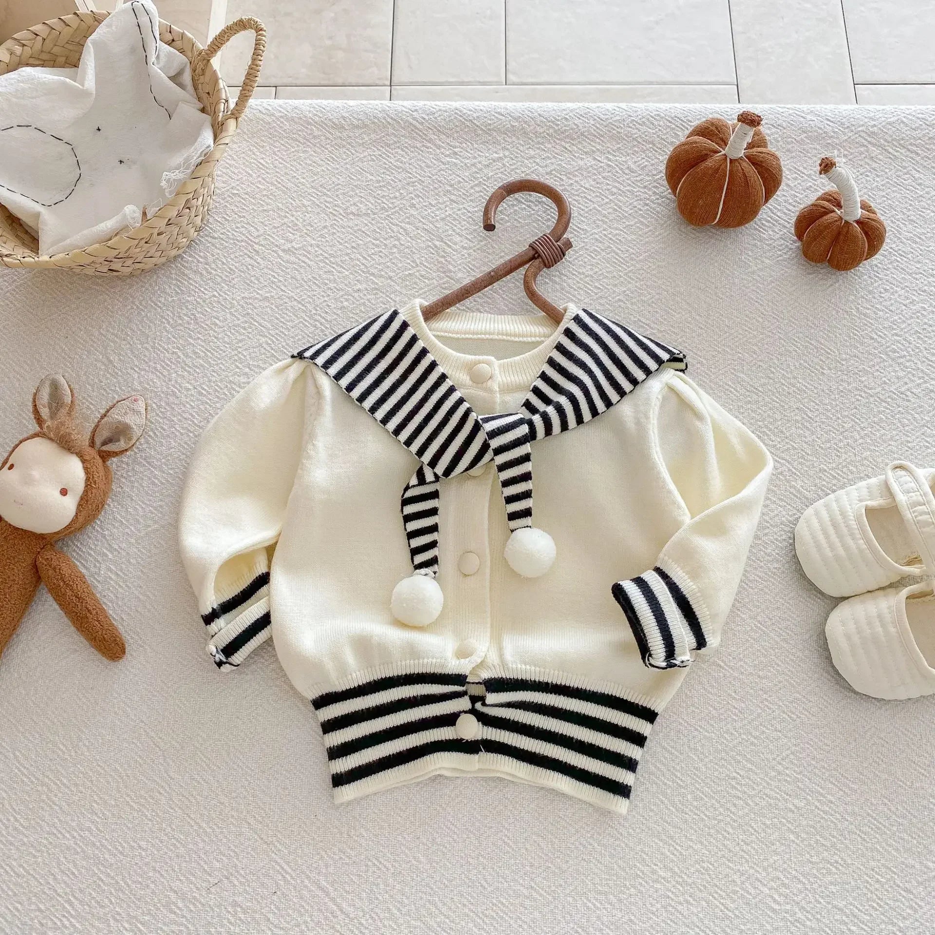Navy Striped Collar Pom-Pom Knit Cardigan